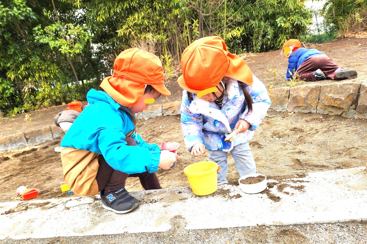 雪と雨上がりの今日、1歳児・2歳児のおしゃら探検隊は、手繋ぎ散歩に行きました。風はあったけど気温があがって、砂場でいっぱい遊びました。前は、乾燥していてサラサラだったけど今日は「砂場の砂が湿っていて作りやすいなあ」